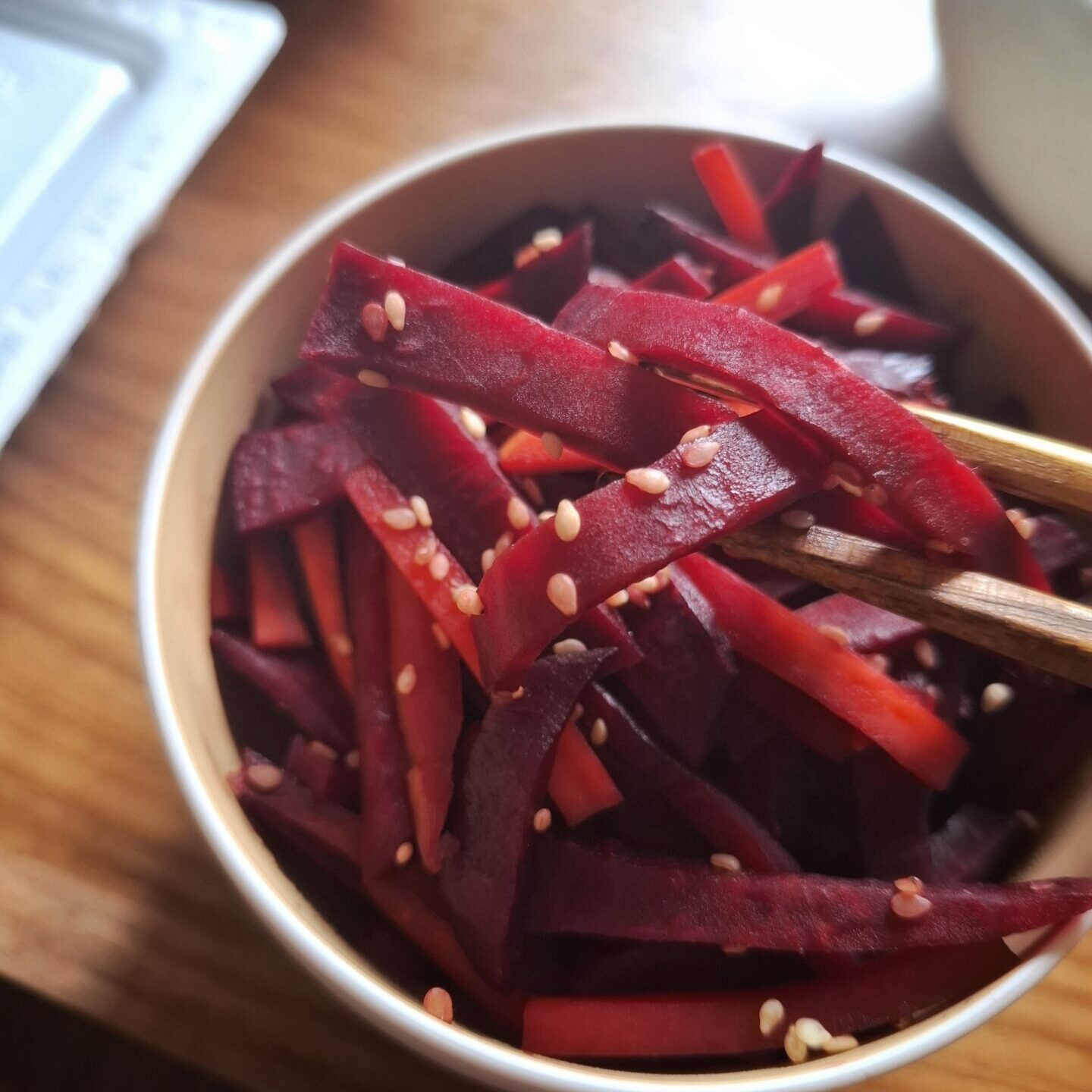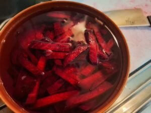 Wash and peel beetroot and carrot. Cut the beetroot first into thin strips, and soak briefly in water to remove excess bitterness. Cut the carrot likewise.