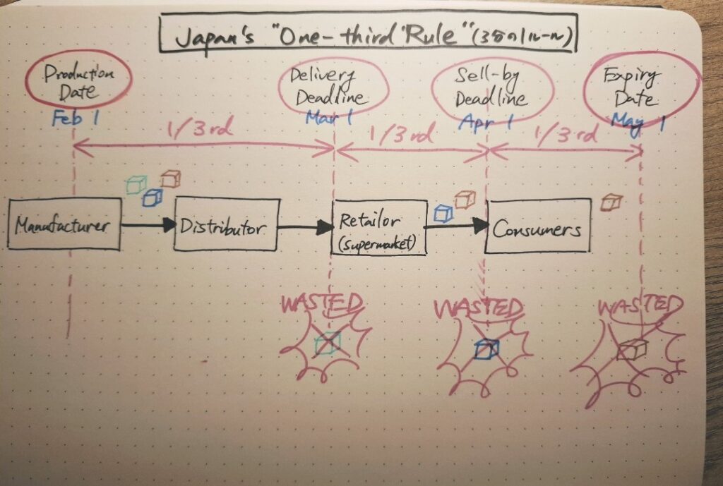 According to Japan’s “One-third Rule,” you must have the items delivered to retailers by Mar 1. Likewise, retailers must sell them by Apr 1. (Look at the figure below.)