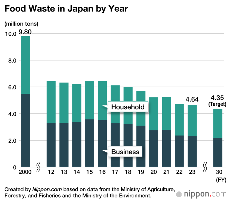 Despite the Japanese government’s statement to halve food waste by 2030 compared to 2000, progress has been slight, as shown below.